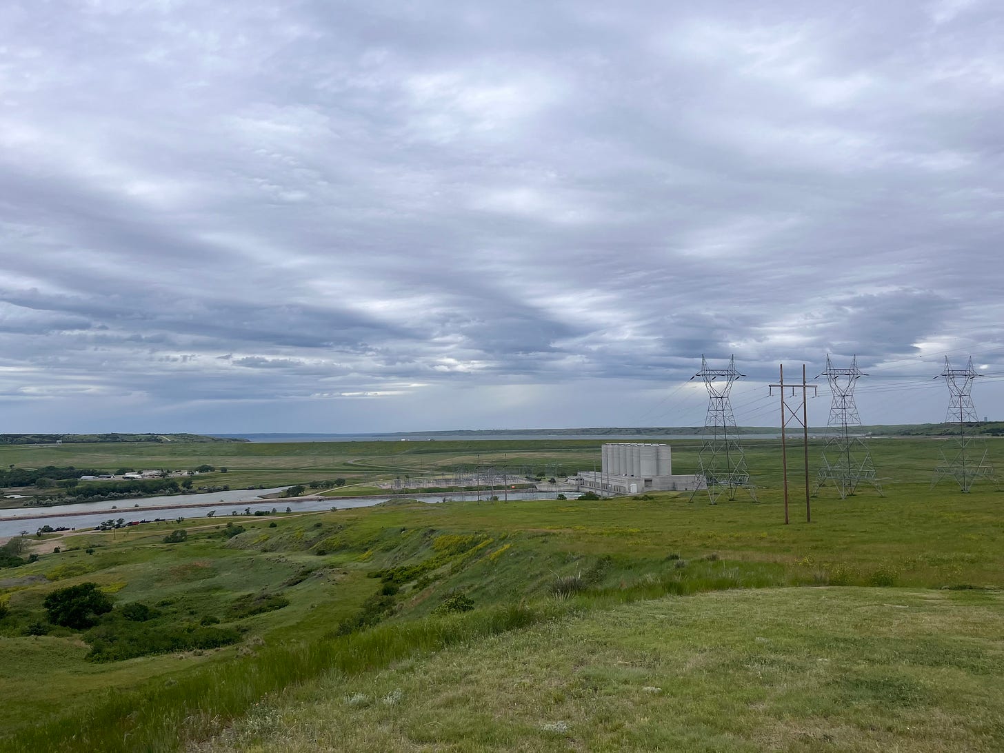 Headwinds. The route led me out of the city up some hills, traveling northeast until I could get back on South Dakota Highway 1804, named after the year Lewis and Clark began their journey west. (There’s also a Highway 1806, referring to the year they returned.) I passed the “approximate geographic Center of North America” according to Google Maps, but I didn’t see the sign. It was a hard wind, exposed on the high ground above Lake Ohahe— the engineered lake stretching from here all the way to Bismarck, North Dakota. I passed the power station turbines below, and the signs commemorating the troubled encounter between Lewis and Clark and the Teton Sioux.